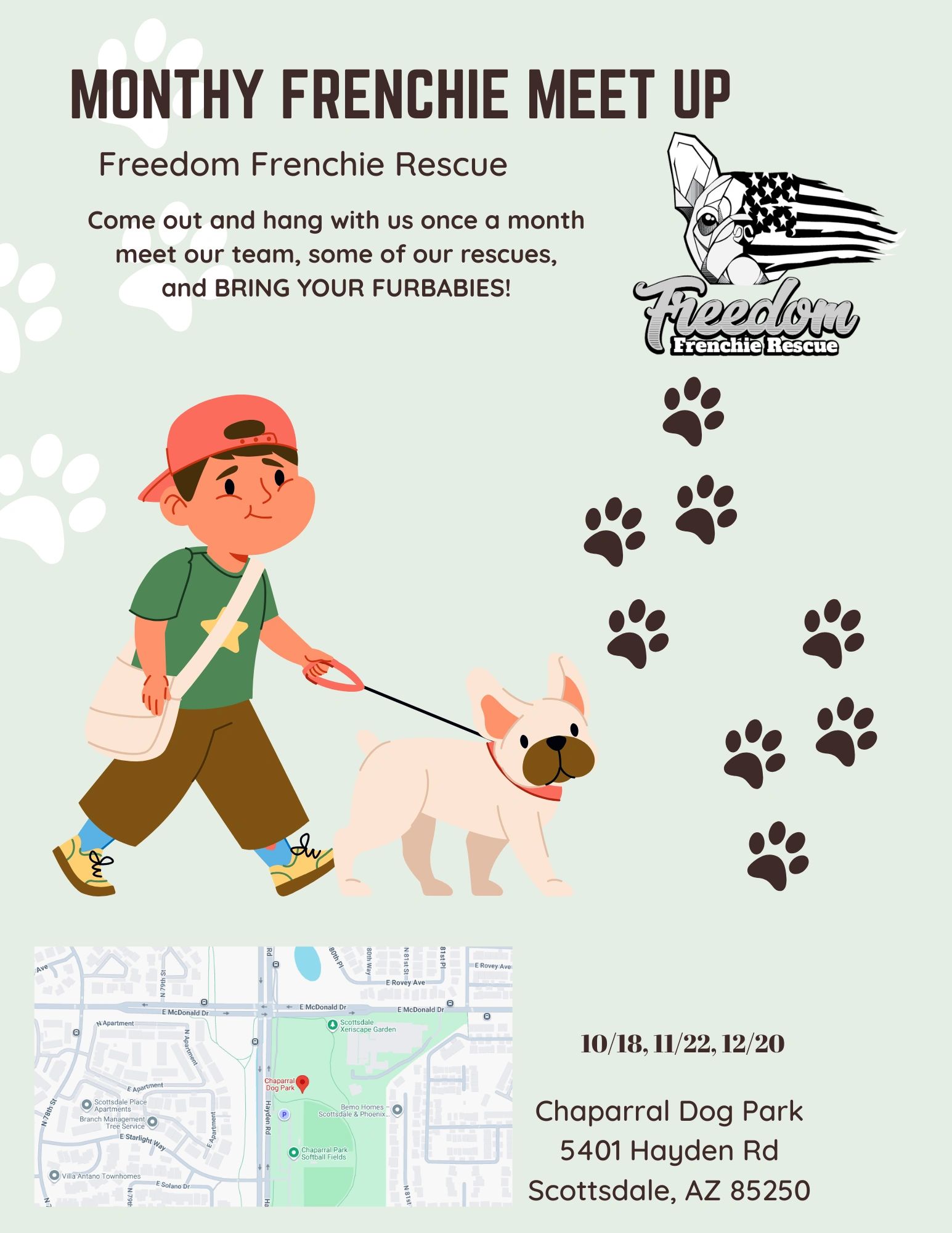 Come and hang out and meet your Frenchie neighbors and community! We have dates set but subject to change. Yes, bring your pups and family members, that is the whole point! Dress to impress for any holiday theme. 7am-9am 10/18, 11/22, 12/20. 2026 dates coming soon!